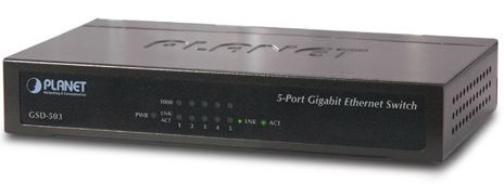 PLANET GSD-503 on metallikoteloitu pienikokoinen 5-porttinen10/100/1000BaseT Gigabit Ethernet kytkin MDI/MDIX-porteilla. Tekniset tiedot: |
